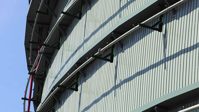 寶鋼彩涂用于中石油儲油罐圍護,采用高耐候鍍鋁鋅彩涂鋼板,顏色為本灰,牌號為TS300GD+AZ,鋁鋅層重量150克/平方米。