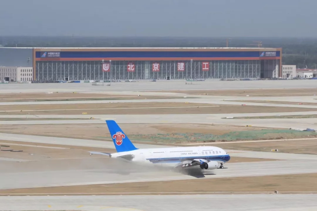 北京大興機場南航機庫,總面積3.9萬平米,鋼結構屋架長404.5米,跨度為世界最大,是北京新機場南航基地內體量最大的單體工程,是亞洲最大的飛機維修庫。機庫共設5個寬體機機位和3個窄體機機位,最多可同時容納包括2架空客A380、3架波音777在內的12架飛機停放維修。南航機庫工程的設計、采購選材、施工建造全過程均體現出中國智慧、中國工藝,是100%的“中國建造”。