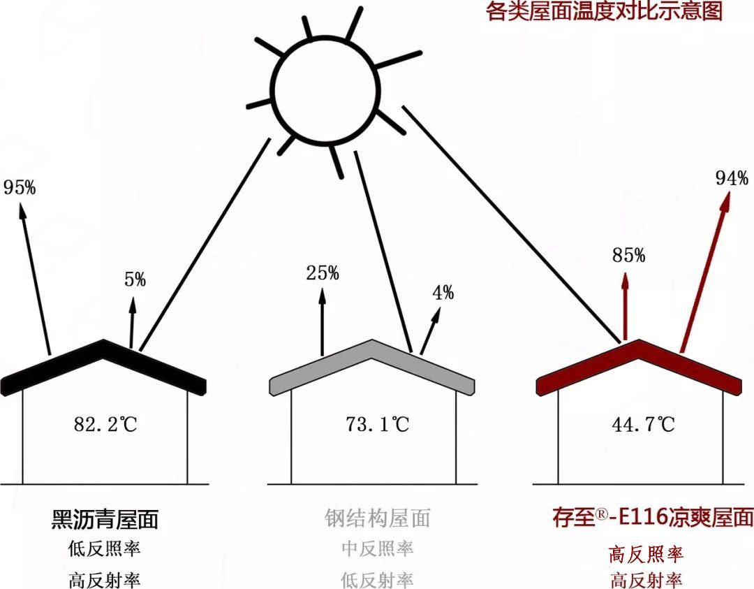 即可以在彩鋼板屋面使用存至®-E116隔熱降溫系統(tǒng),該系統(tǒng)能對(duì)400-2500nm范圍的可見(jiàn)光與近紅外線進(jìn)行高反射,全面反射85%太陽(yáng)光和對(duì)外反射95%的太陽(yáng)能(即熱能),有效阻止太陽(yáng)光的熱量累積,其涂料組份中微結(jié)構(gòu)成分特殊的快速散熱特性使得95%以上太陽(yáng)輻射能量不被建筑體吸收,隔住外部熱量向建筑體內(nèi)部傳導(dǎo),確保了建筑體內(nèi)部空間保持持久恒溫的狀態(tài),是真正意義上的隔熱。該系統(tǒng)有效降低了屋面溫度15-30°C,室內(nèi)溫度3-5°C(實(shí)驗(yàn)室數(shù)據(jù),具體因現(xiàn)場(chǎng)環(huán)境存在差異),降低空調(diào)降溫費(fèi)用達(dá)20%-70%。隨著我國(guó)對(duì)于建筑隔熱節(jié)能工作的政策性指導(dǎo),以及廣泛提及的"綠色建筑"領(lǐng)域,都是在倡導(dǎo)有效的隔熱保溫、節(jié)約電力、保護(hù)環(huán)境、節(jié)約能源。