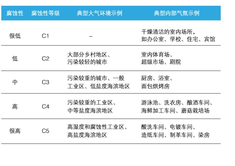 我國國家標準GB/T19292.1根據(jù)碳鋼、鋅、鋁等金屬第一年腐蝕速率測量值對大氣腐蝕性進行了分類,但是彩涂板還缺乏使用環(huán)境(指大氣環(huán)境和內(nèi)部氣氛)腐蝕性分類的數(shù)據(jù),僅定性的將大氣環(huán)境和內(nèi)部氣氛腐蝕性分為5個等級即C1、C2、C3、C4、C5,其腐蝕性依次增強,表示給出了不同腐蝕性等級對應(yīng)的典型大氣環(huán)境和內(nèi)部氣氛。