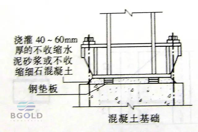 a. 墊板應(yīng)設(shè)置在靠近地腳螺栓的柱腳底板加勁板下,每根地腳螺栓側(cè)應(yīng)設(shè)1~2組墊板。墊板與基礎(chǔ)面得接觸應(yīng)平整、緊密。二次澆灌混凝土前墊板組間應(yīng)點焊固定。