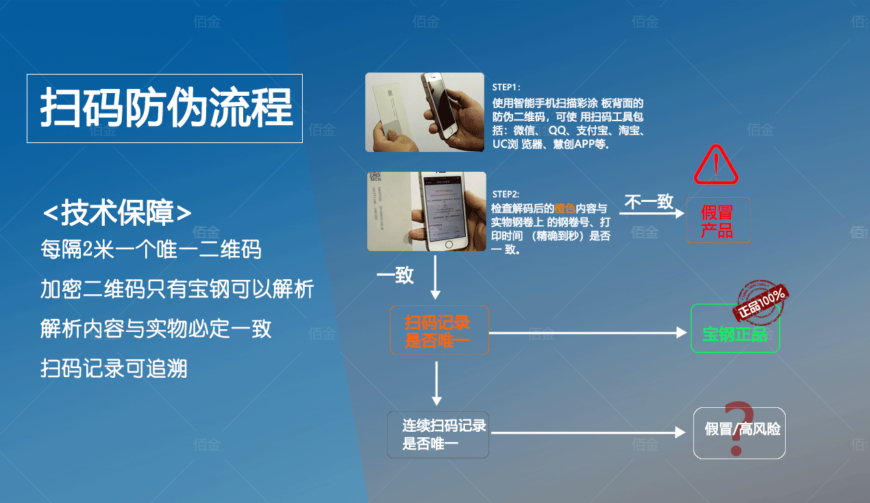寶鋼彩涂板是目前國內很多重點工程的常用材料,廣大設計院和業主都積極推薦和選用寶鋼彩涂板。但是市場上出現了仿冒的寶鋼彩涂板,魚龍混雜,真假難辨,給用戶的辨別和使用帶來困惑,如何辨別真偽,是寶鋼和用戶共同關心和迫切需要解決的問題。
